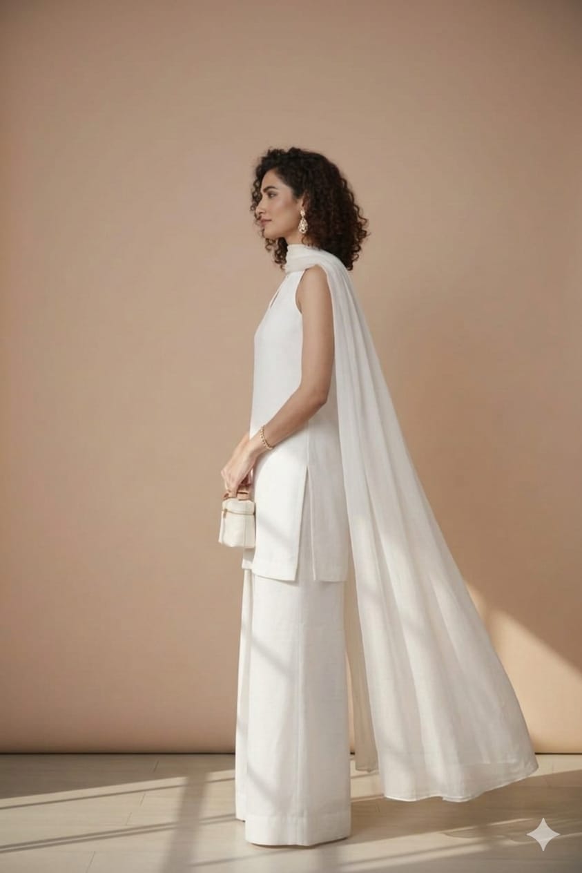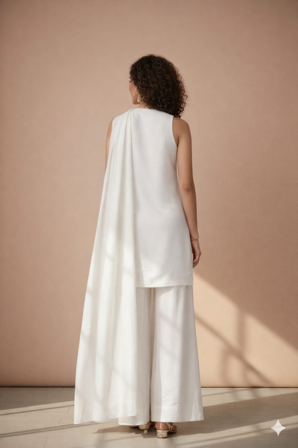 Effortlessly elegant, this ivory ensemble is designed for modern sophistication. The sleeveless tunic features a refined high neckline with a subtle keyhole detail, creating a graceful and polished look. A soft draped cape flows from the shoulders, adding movement and a touch of drama to the silhouette.