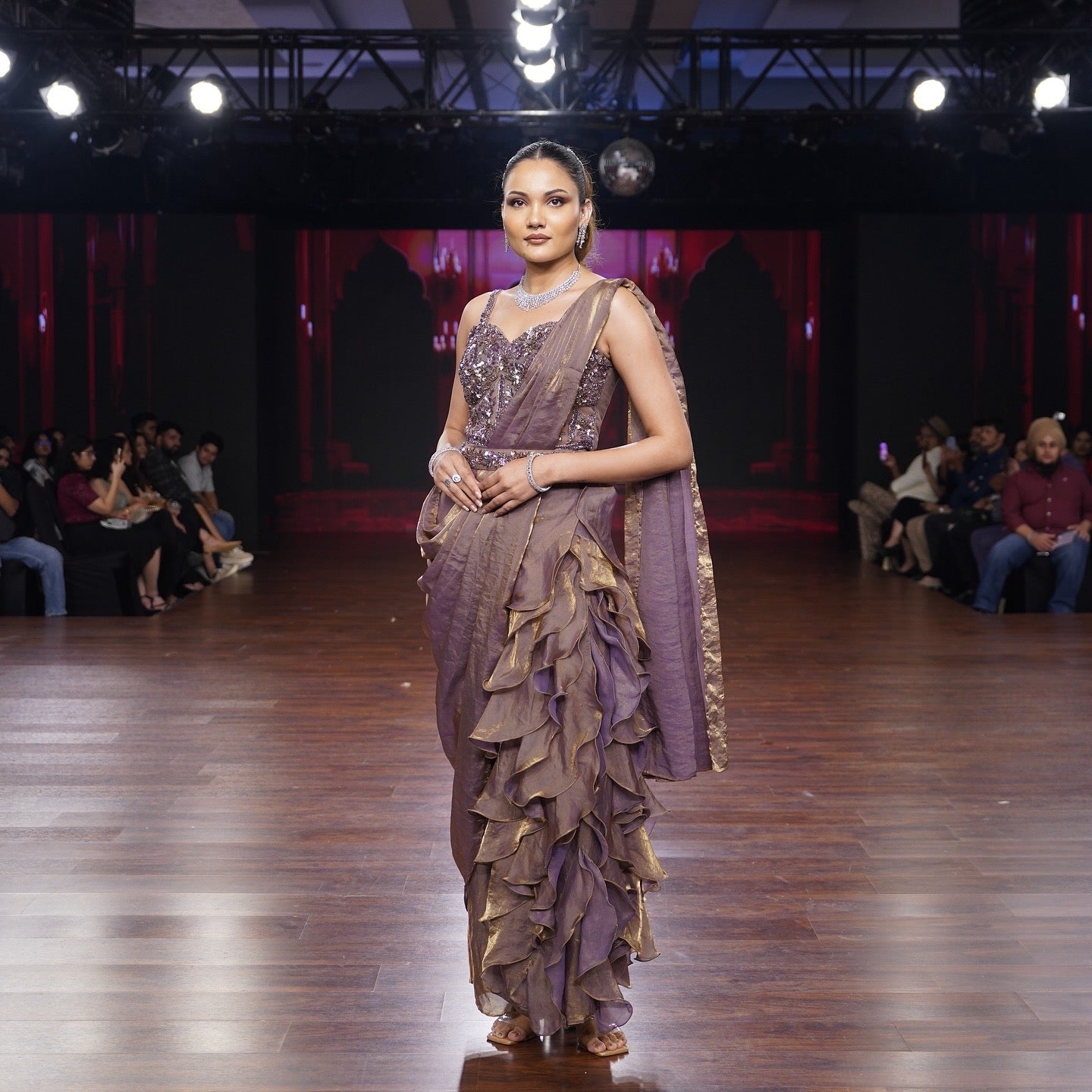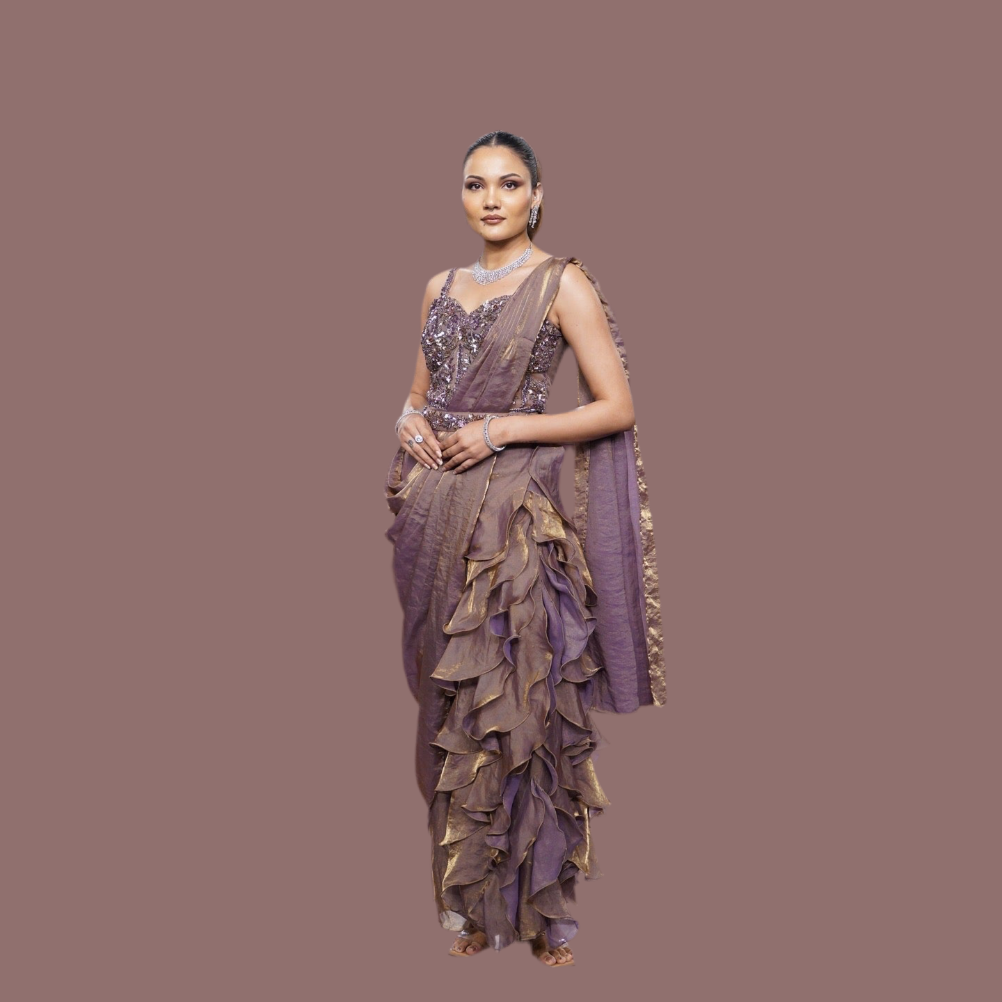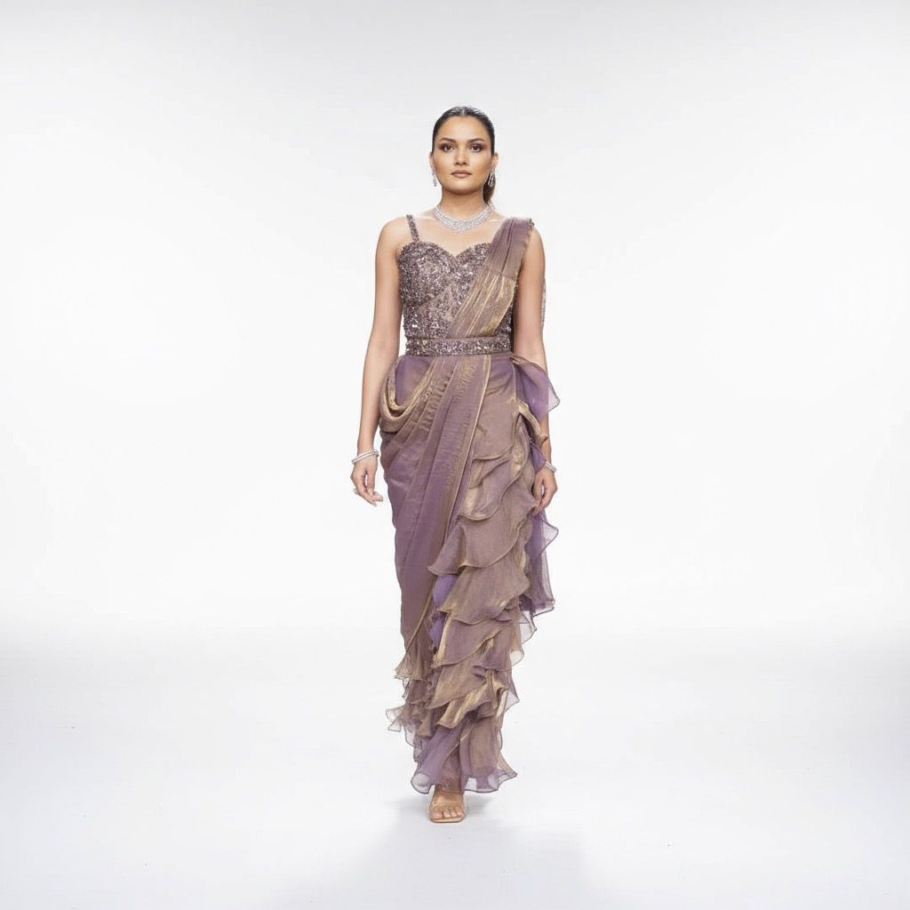 draped in elegance this marjaan drape saree is adorned with intricate hand embroidery and delicate beadwork set against a regal mauve gold hue that whispered luxury. its a 2 pc set of ready to wear drape saree with blouse .