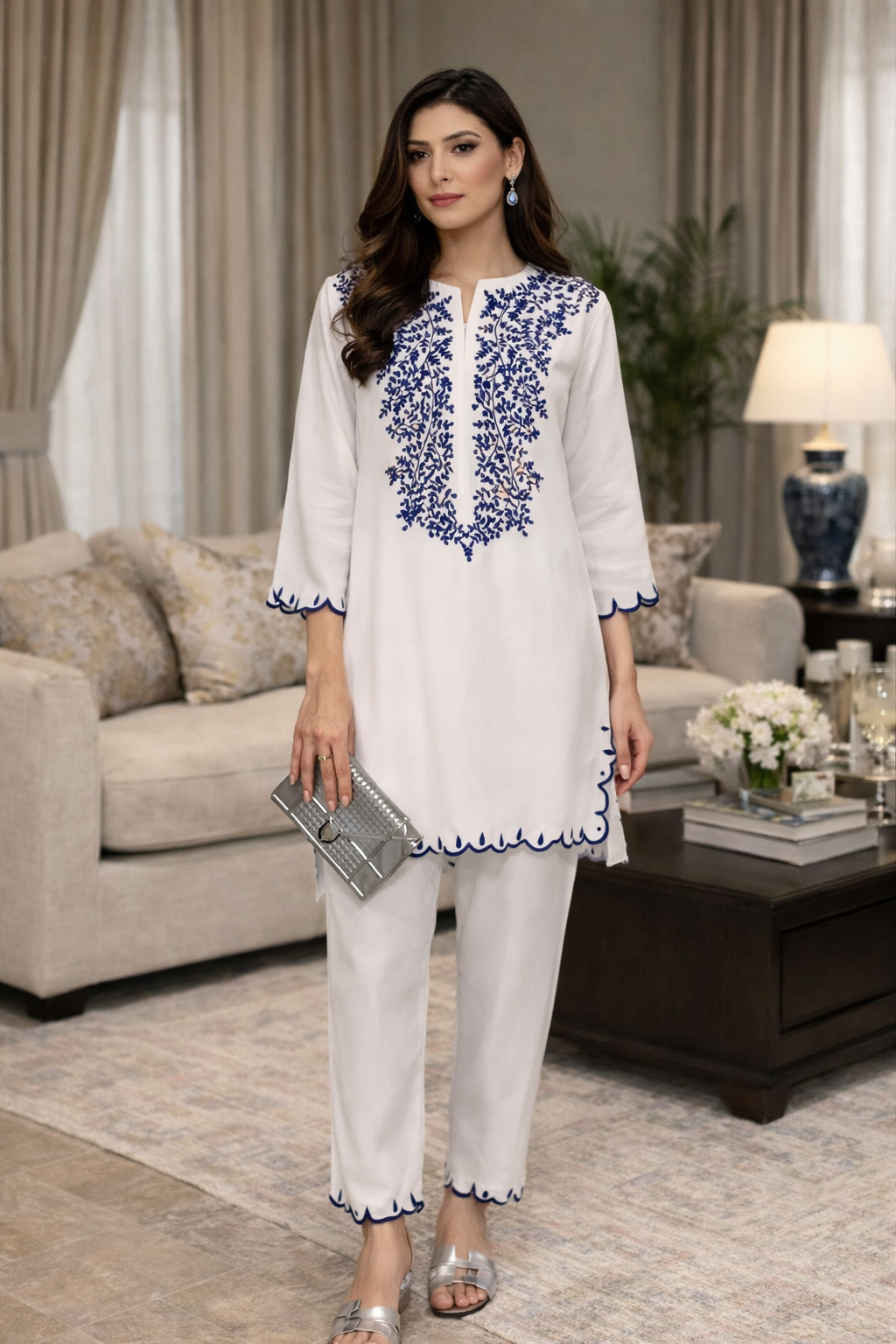 Grace meets effortless sophistication in this timeless ivory and blue co-ord set by Zarana. Designed for women who love understated elegance, this ensemble features delicate royal blue floral embroidery beautifully cascading along the neckline, creating a refined yet eye-catching statement.